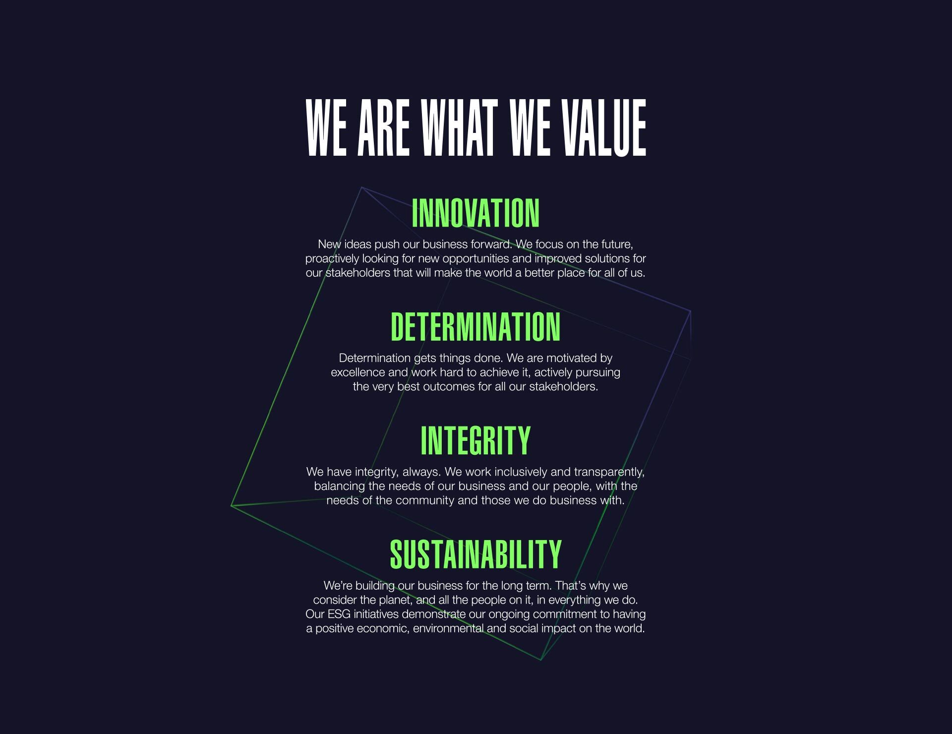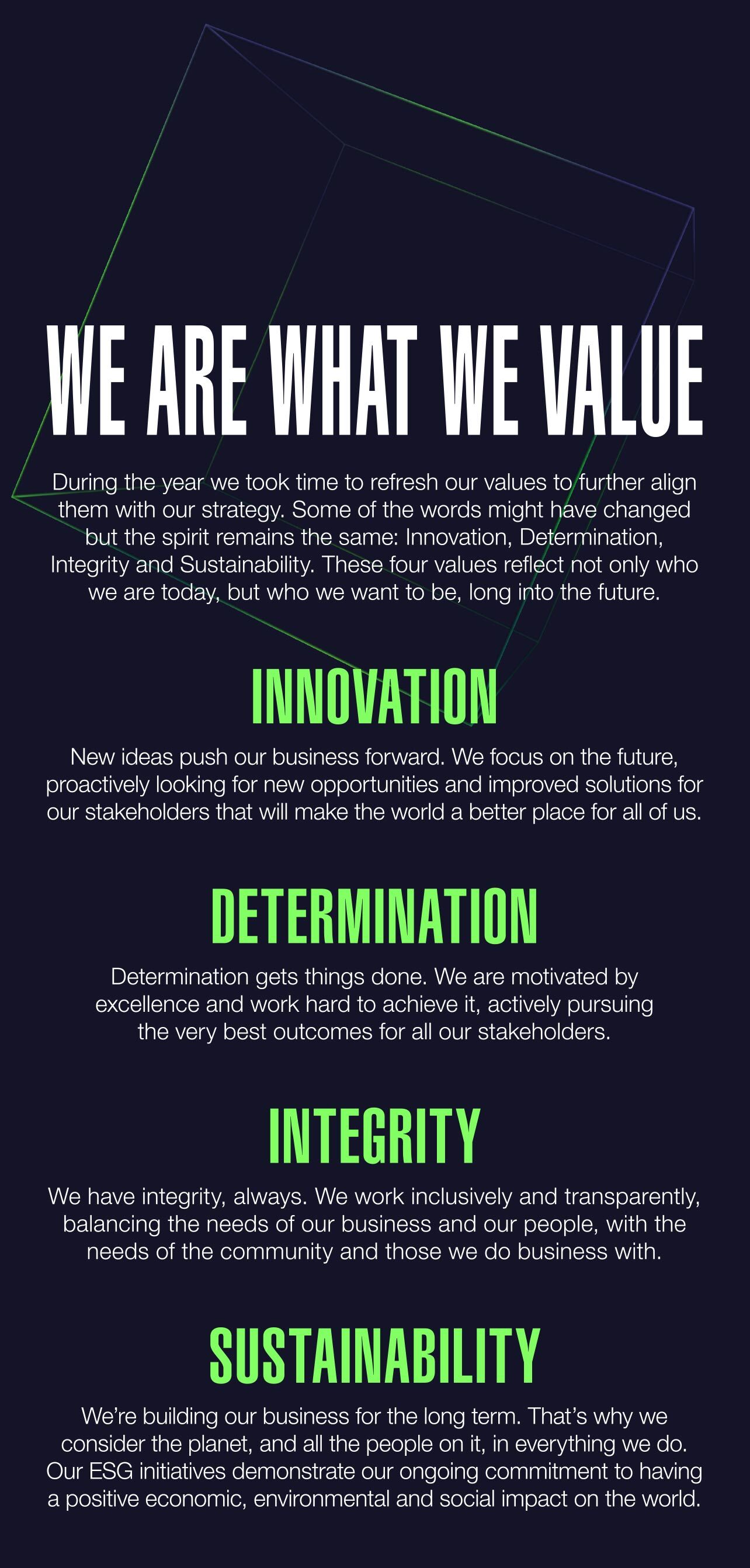 During the year we took time to refresh our values to further align them with our strategy. Some of the words might have changed but the spirit remains the same: Innovation, Determination, Integrity and Sustainability. These four values reflect not only who we are today, but who we want to be, long into the future.